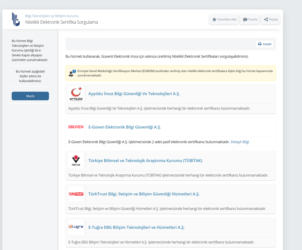 E-Devlete girdikten sonra Nitelikli Elektronik Sertifika Sorgulama olarak aratarak tüm BTK’dan yetki alarak Elektronik imza üretebilen tüm Elektronik Sertifika Hizmet Sağlayıcısı (ESHS)’lar ‘da adınıza düzenlenmiş geçerli/geçersiz E-İmzalarınızın detayına ulaşarak kontrol edebilirsiniz.