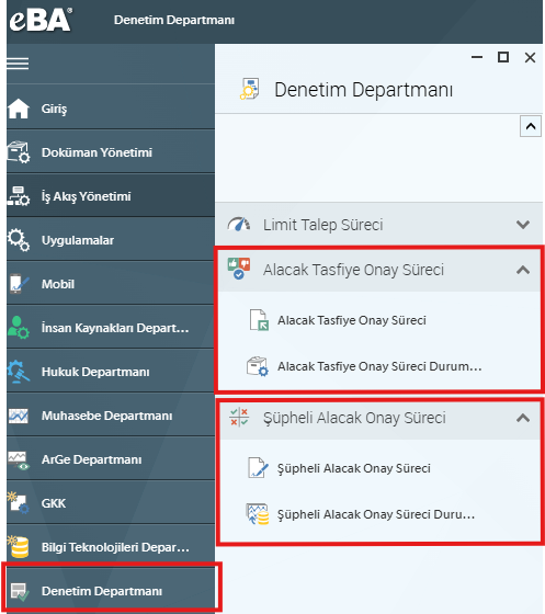 “Şüpheli Alacak Süreci” ve “Tasfiye Onay Süreci” eBA ortamında Bursa şubemiz için kullanımına açılmıştır. Başlatılan süreçler kapsamında doldurulan onay formları dijital ortamda yöneticilerimizin onayına sunulmaktadır. Aşağıdaki ekran görüntüsü üzerinden sürece erişebilirsiniz.